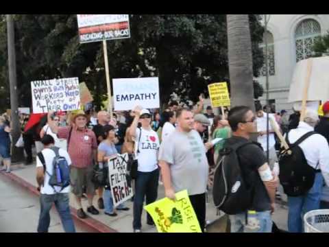 Protesters gather at the West entrance to the LA City Hall as the LAPD holds an event showing off weapons, equipment, Bomb detection Robots, etc at the South end of the City Hall.